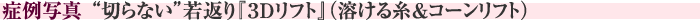 - 糸ã¨ã‚³ãƒ¼ãƒ³ãŒæº¶ã‘ãŸå¾Œã‚‚ã€ãƒªãƒ•トアップ効果ã¨ç¾Žè‚ŒåŠ¹æžœãŒæŒç¶šã—ã¾ã™ã€‚