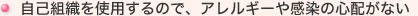 自分ã®çµ„織以外ã®ã‚‚ã®ãŒä½“内ã«å…¥ã‚‰ãªã„“安心感â€ãŒç‰¹é•·ã§ã™ã€‚自己組織ã®ä½¿ç”¨ãªã®ã§ã€ã‚¢ãƒ¬ãƒ«ã‚®ãƒ¼ã‚„感染症ã®å¿ƒé…ãŒã‚りã¾ã›ã‚“。